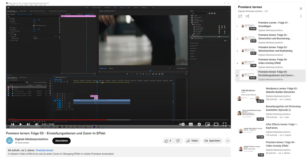 Dazu haben wir uns die ersten fünf Folgen auf YouTube angeschaut und alle erwähnten und vorgezeigten Effekte und Bearbeitungen angewendet. Wir haben verschiedene Effekte wie zum Beispiel Boomerang und Loop verwendet und Masken für das ZoomIn und das Spiegeln.