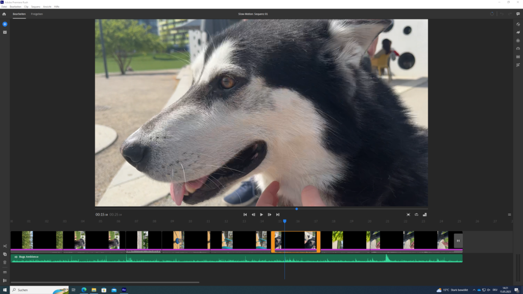 Für diese Aufgabe haben wir ein paar Videos aufgenommen, diese dann auf Premiere Rush um 50% verlangsamt und angepasst. Anschließend habe ich dann noch Musik hinzugefügt und das Video heruntergeladen.