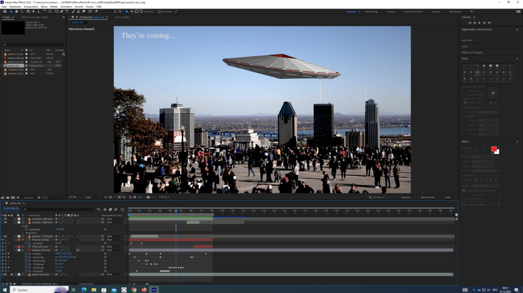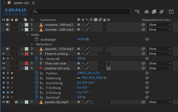 Für diese Aufgabe haben wir mit After Effects gearbeitet. Es wurde ein Video eingefügt und wir haben Sounds hinzugefügt und das Ufo so bearbeitet, damit es sich bewegt, seine Position, Skalierung und Deckkraft geändert. Ein Soundeffekt fürs Ufo selbst wurde auch von mir eingefügt. Mit Text haben wir dann das Video vollendet.