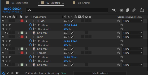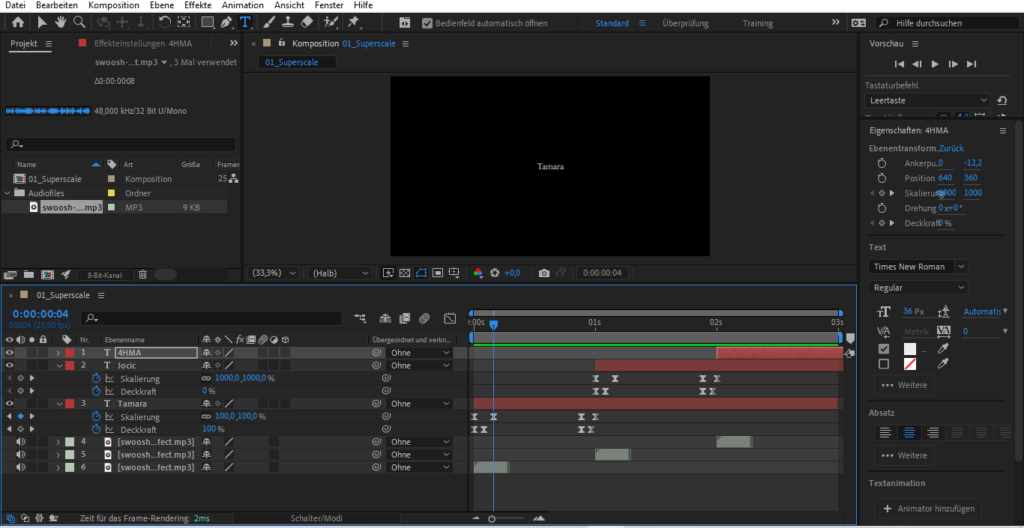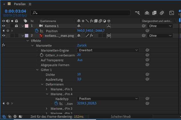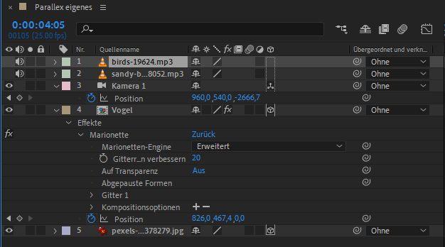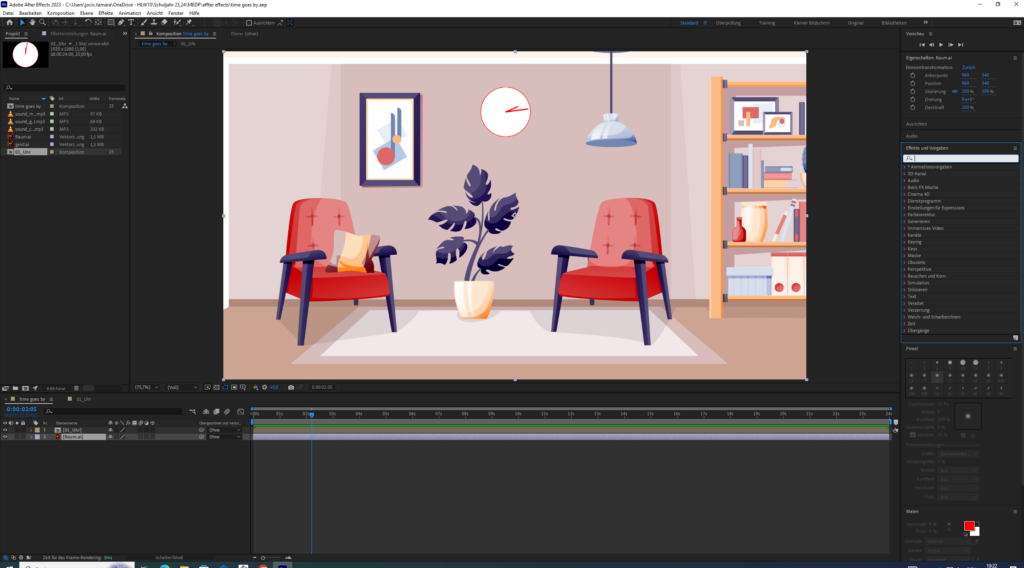 Bei dieser Aufgabe haben wir ebenfalls in After Effects gearbeitet, die Position und Kameraperspektive geändert. Wir haben auch leichte Bewegungen einzelner Körperteile hinzugefügt.