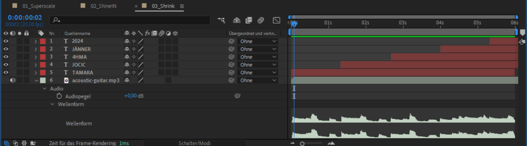 Bei dieser Aufgabe haben wir in After Effects mit verschiedenen Textanimationen gearbeitet. Wir haben unter anderem die Texte skaliert und ihre Deckkraft geändert. Um alles intensiver wirken zu lassen, haben wir danach noch soundeffects eingefügt.